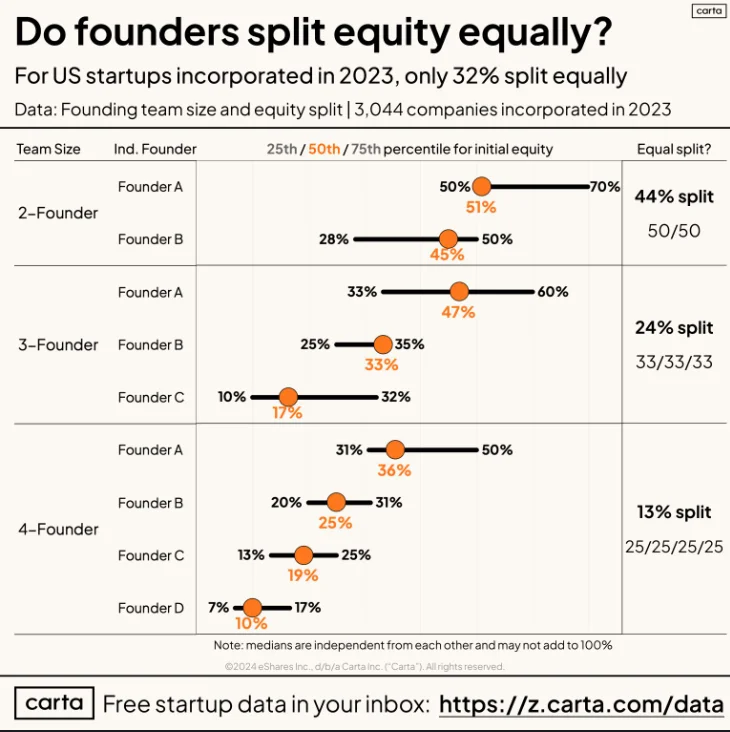 41% of companies split equity equally <source : Carta Peter Walker>