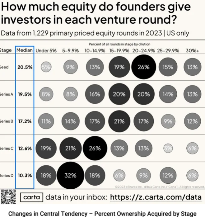 Peter Walker from Carta published the following data (2023) that shows the Median and distribution of dilution per round. It starts with Seed with a median of 20.5% and trending down as the round progress.