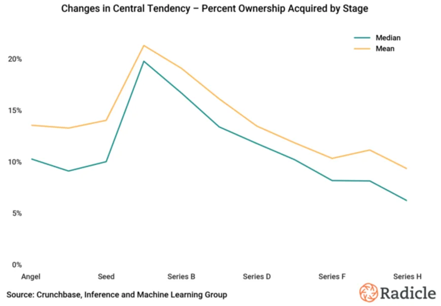 An article (2019) from Sebastian Quintero at Radicle which is based on 8,639 funding rounds from Crunchbase, show that the dilution rates seem to generally decrease as the round progresses (Angel -> Series) but with the exception of preseed/angel rounds. You can see the median for Angel rounds being around 10% at start, move down and shoot up for Series A, and trend down after. (below)