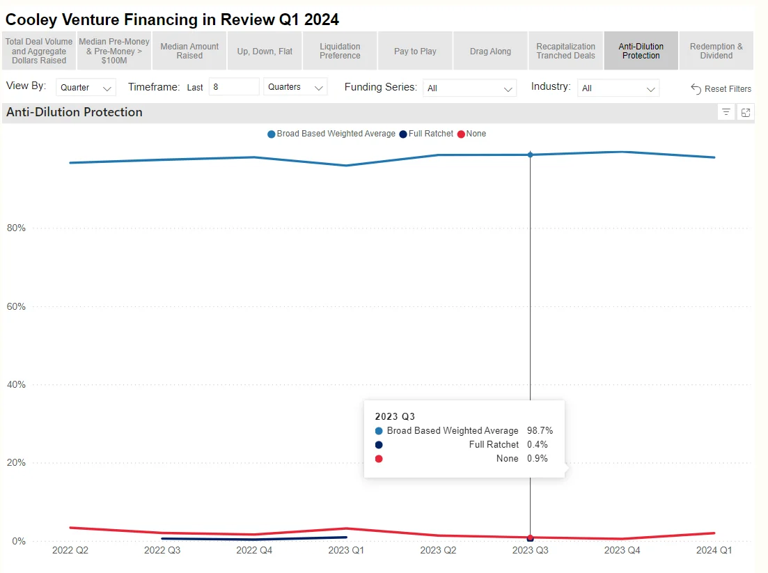 Full rachet is so uncommon in US venture financing that 0% of deals done by Cooley in Q1 2024 has them, and they only appear in their data as 0.4% of the deals in the Q3 2023. (Below)
